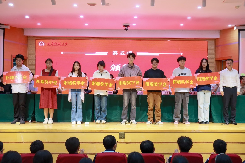 图为学校团委书记孔轶众为阳瑞奖学金获得者颁奖